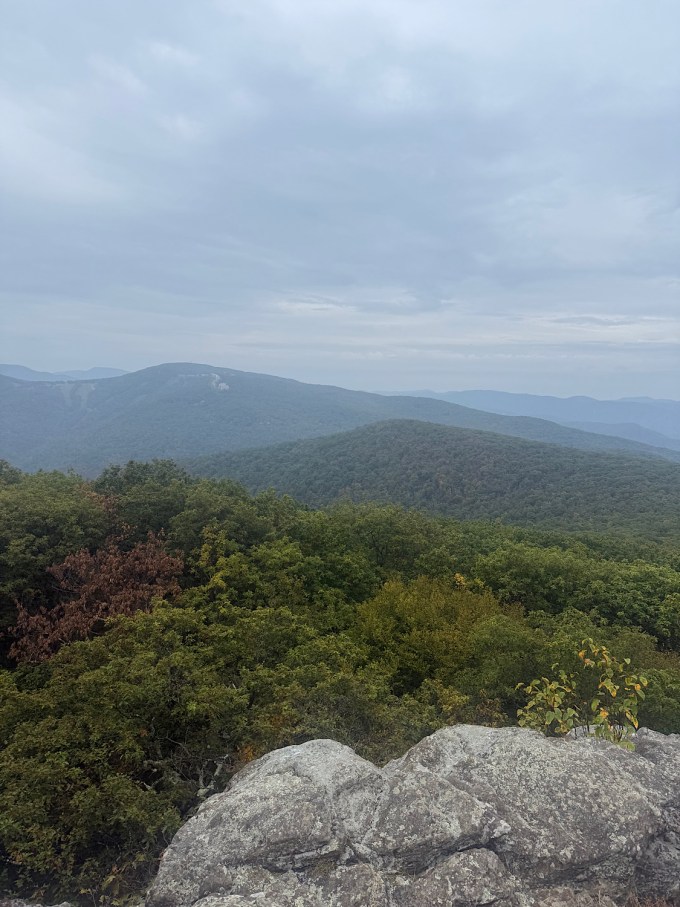 Got my shuttle (Zubin of Valley Shuttle Services – great guy, good prices) to Reid’s Gap and continued hiking south. Had only one real climb, a 1200 foot elevation gain ascent of Three Ridges, a 3965-foot peak. I think that’s the highest peak I’ve been on since Maine. There was a gorgeous viewpoint on the way up. Truly stunning. Then it was a 3000-foot descent down to Route 56. On Sunday, after the storm passes, I will ascend over 3000 feet up The Priest.